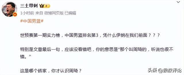 媒体人三土带刺发文点“世预赛第一期实力榜,中国男篮排名第3,凭什么伊朗在我们前面???